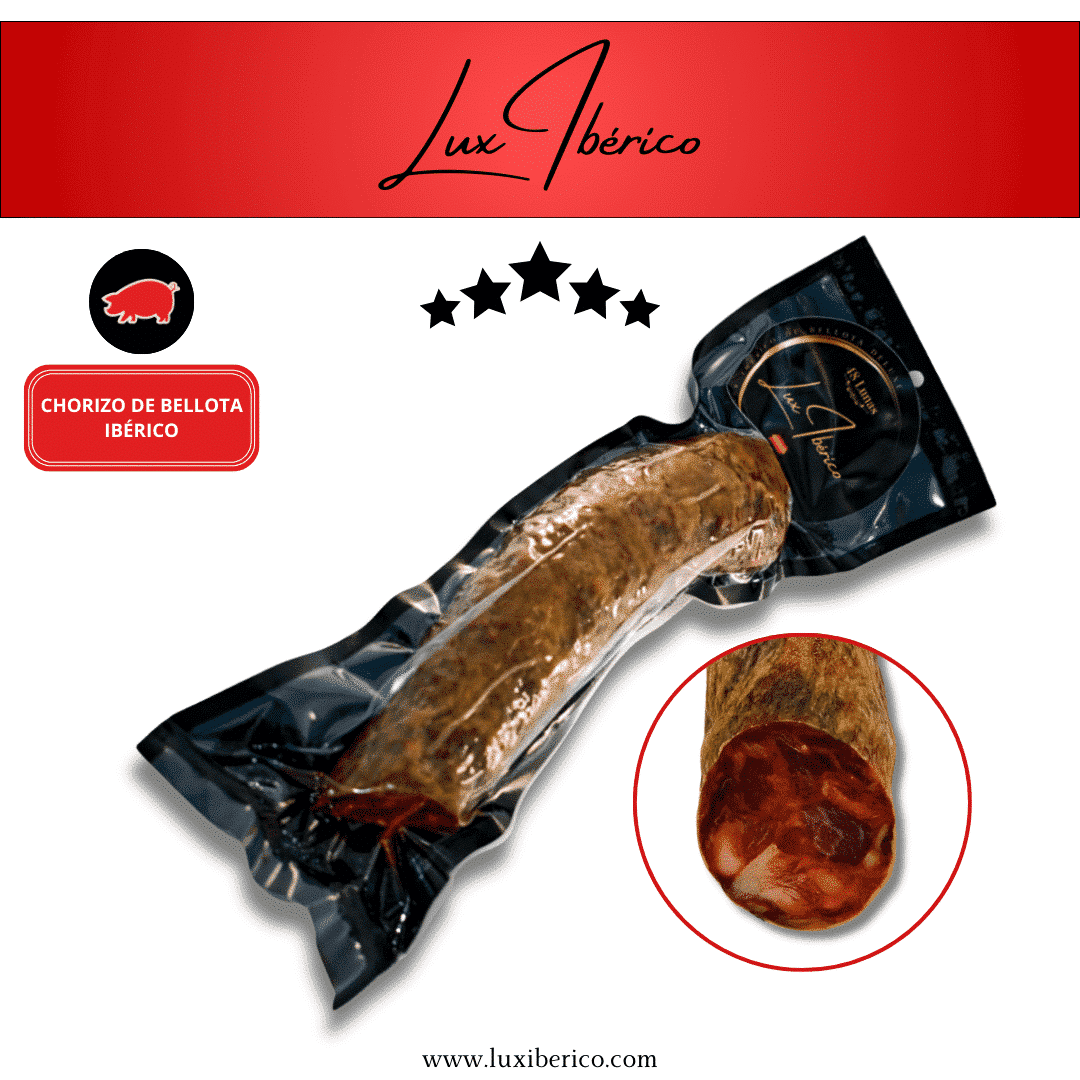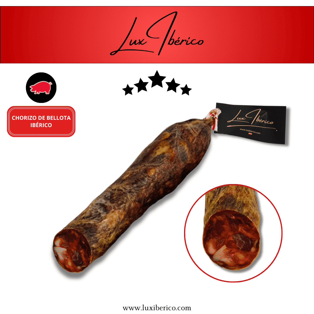 Chez Lux Ibérico, nous vous apportons directement d’Espagne le Chorizo Ibérico de Bellota, un joyau gastronomique pour les palais les plus exigeants. Chaque pièce, d’un poids d’environ 700 g, est soigneusement sélectionnée auprès des meilleurs producteurs ibériques, ce qui garantit une qualité supérieure et une saveur exceptionnelle.