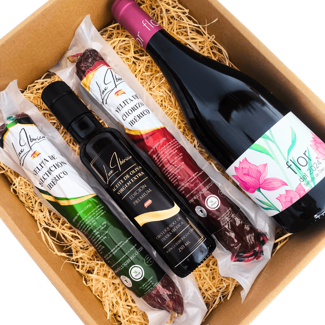 La Cesta Regalo Gourmet “Iberitus” combina lo mejor del sabor ibérico en una presentación equilibrada y refinada. El vino tinto se mezcla con embutidos de calidad y un aceite de oliva virgen que realza cada matiz. Una elección gourmet para regalar o compartir.