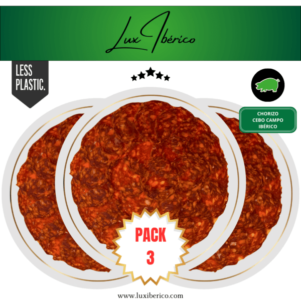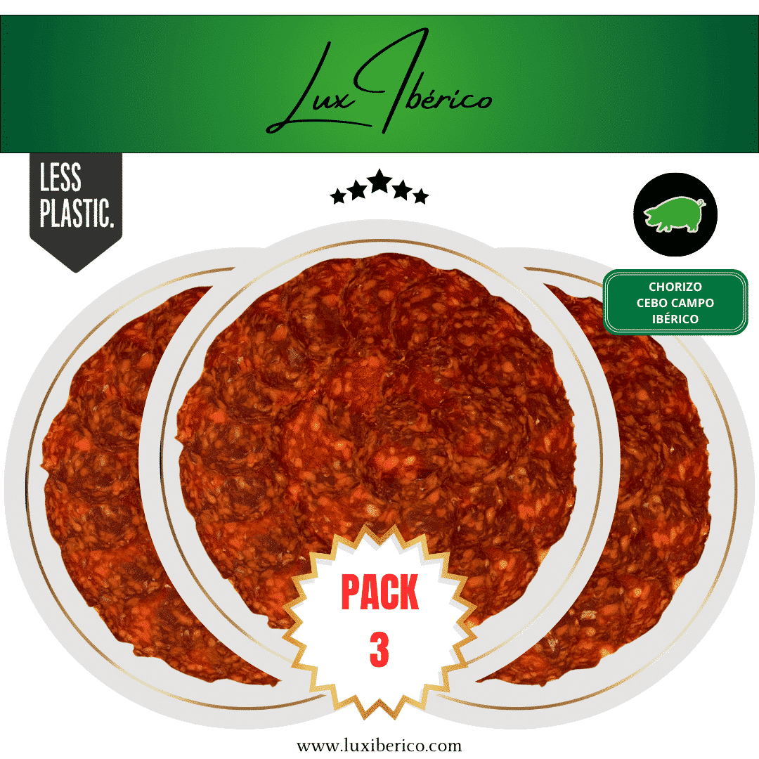 Lux Ibérico se enorgullece de ofrecerte el Chorizo Ibérico de Cebo Campo (Pack de 3 sobres de 80g), un tributo al patrimonio culinario español. Este chorizo procede de cerdos ibéricos criados en las dehesas, en un ambiente de semi-libertad, alimentados con una dieta rica en pastos, hierbas, y complementada con cebo de campo, lo que garantiza un sabor robusto y una textura jugosa.
