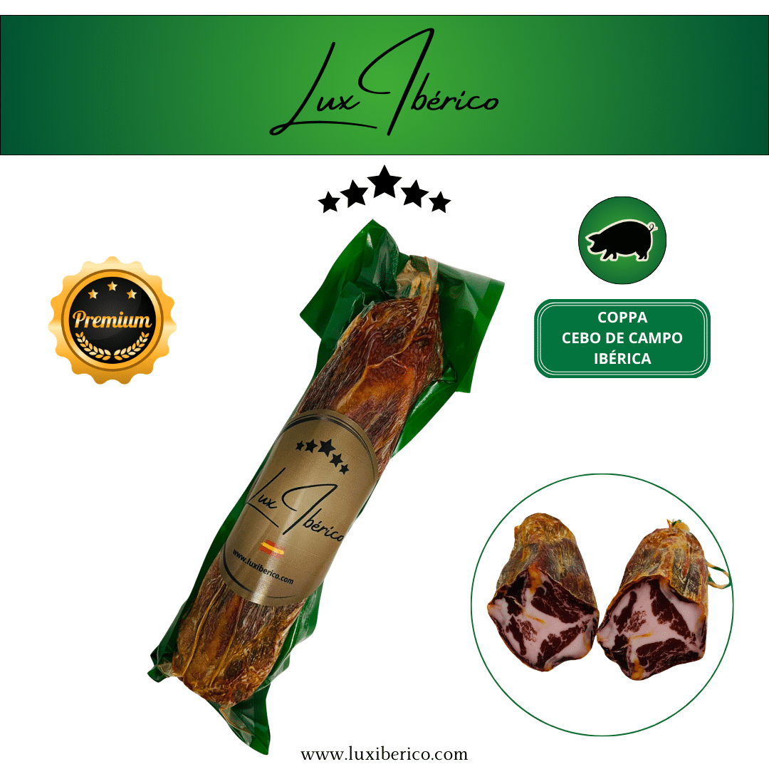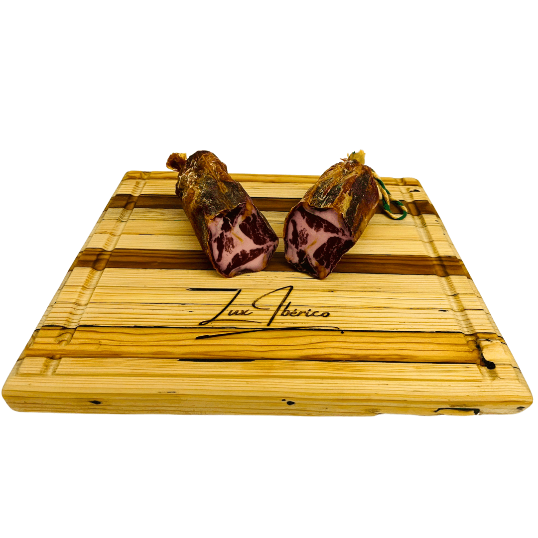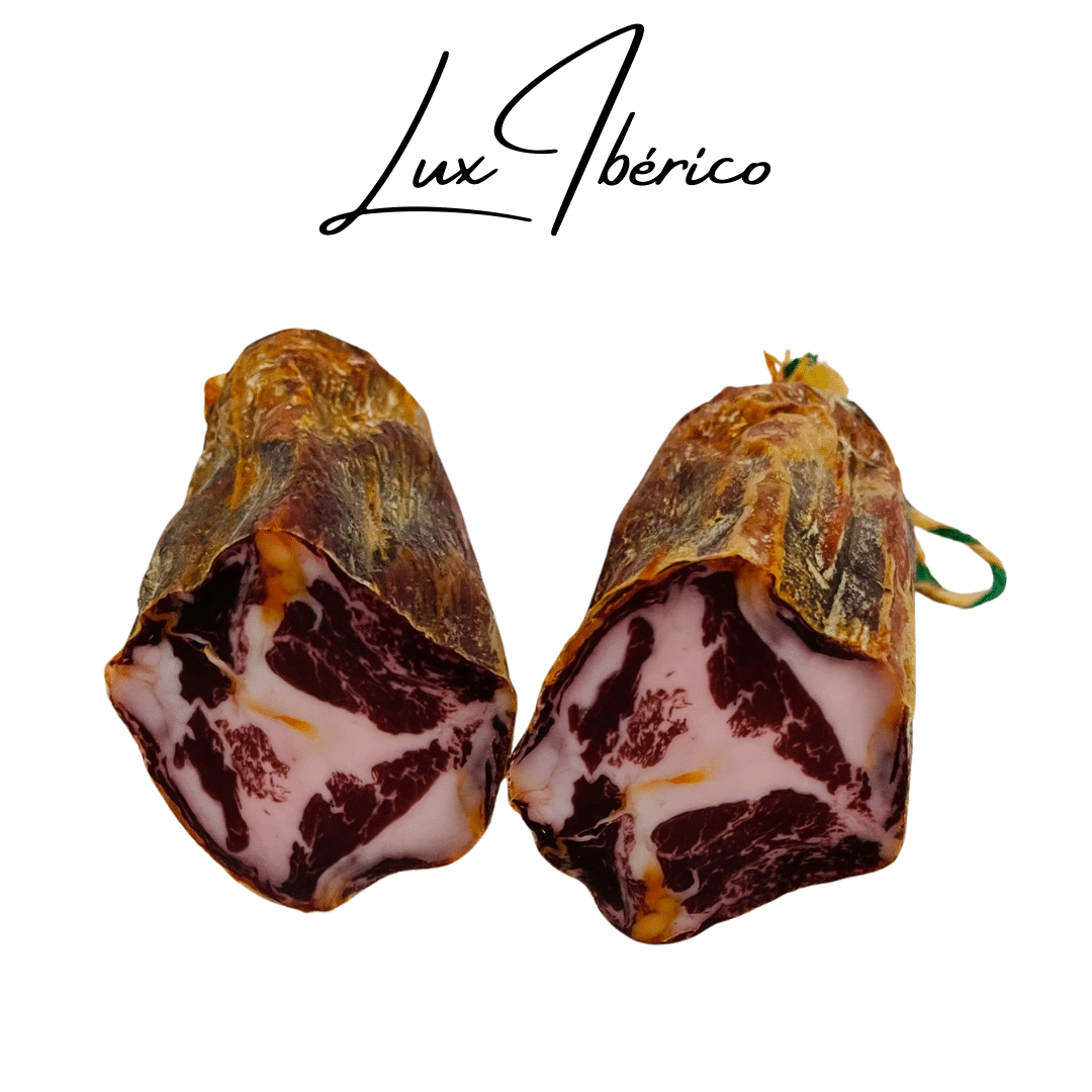 La Coppa Ibérica de Lux Ibérico procede de la tradición italiana, derivada del término “capicola”, que significa “cabeza” y “cuello”. Se elabora a partir de la cabeza de la paletilla y el cuello de cerdo de bellota, curados enteros de manera artesanal para preservar todo su sabor.