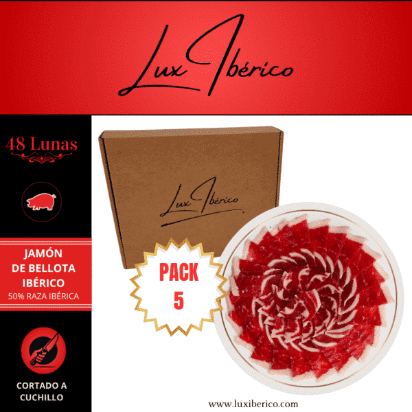 En Lux Ibérico, te presentamos el Jamón 48 Lunas – 50% Raza Ibérico de Bellota (Pack 5 sobres de 90g cortado a mano), un producto que es sinónimo de lujo y calidad. Cada sobre contiene 90g de jamón ibérico de bellota, proveniente de cerdos de 50% raza ibérica, alimentados con bellotas en las dehesas españolas. Esta dieta enriquece el jamón con una grasa saludable, contribuyendo a un sabor más profundo y una textura más rica.